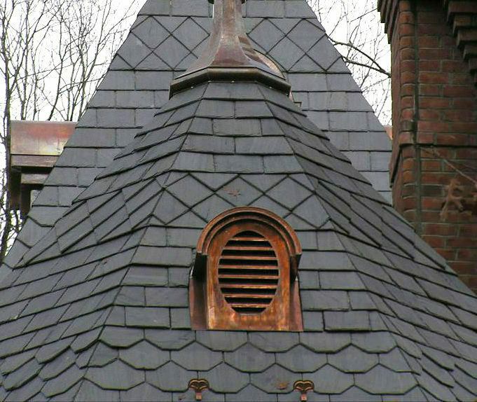Although different layouts of roof may have functional value, it is the selection of a pattern that will marry a roof to the building on which it sets. Different architectural styles will call for different applications of slate. A Colonial or Plantation style building will best be complemented by slates all of a common width and a common height. A Georgian style building looks quite nice with a graduated roof. Victorian structures may have specially cut scalloped, beaver tailed, fish scaled, or diamond point slates inlaid in the field of regular courses of slate. Tudor style buildings might receive a cottage style treatment on its roof. Staggering the butts of slates can offer relief from an otherwise monotonous or regular roof. Sometimes accents such as flowers or dates are even created by using slates of a different color than the rest of the roof.
